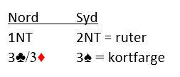 I denne illustrasjonen antar vi at makkerparet har både 2 spar- og 2 grandsvar over 1 grand som minoroverføring, så 2 spar viser kløver (evt. kløver eller begge minor), mens 2 grand viser ruterfarge, Jeg anbefaler at disse meldingene ikke brukes med minorfarge og firekorts major, da kan vi starte med Stayman.