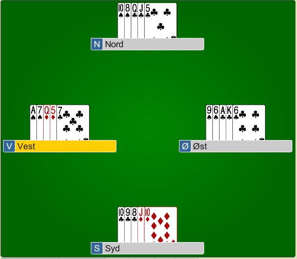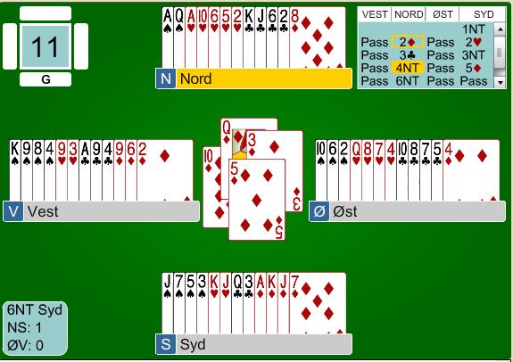 Syd må gi opp kløverholdet, kan ikke sake en ruter til, da står resten av rutern til spillerfører. Nord følger med uten problemer. På ruter dame fra spillefører er Nord ferdig. Enten tar du siste stikk på spar 9 eller så tar kløver 6 det 13nde stikket.