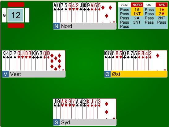 Kristen Midtlid og Olav Vaagen satt Ø/V og Kristen startet med pass. Petter Haram i Nord åpnet i 1 kløver som lover 2+ kløver. Denne åpningen er nok ikke en standard 2. håndsåpning, og de fleste vil vel passe med denne hånden. Videre meldingsforløp med Petter og Tommy Skodje er; 1 ruter er svak med ruter eller utgangskrav dersom det meldes major i neste omgang. 1NT kan innholde 4-kort major noe som vises i neste melderunde og man havner til slutt i 3NT. Olav fant ikke noe optimalt utspill når han innledet med liten kløver, dette sikret Petter 2 kløverstikk. Kontrakten står hele veien og til slutt ble det 11 stikk etter et ruteravkast for mye hos øst.