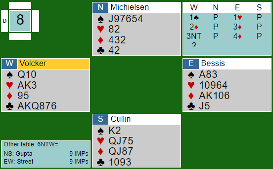 Volcker-Bessis sitt system gjorde at meldingene gikk litt spesielt uten at det ble gitt noen forklaring på BBO. De endte i 6 kløver med vest som spillefører. Nord spilte ut hjerter 8 til tieren, knekten og esset. Merk at syd fortsatt stopper hjerteren siden han har hjerter 7.