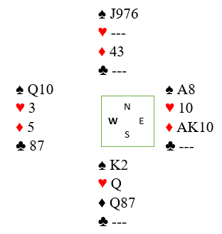 Så tok han en trumfrunde til og kastet hjerter fra øst, og syd kastet også hjerter. Nå var spillefører på rett spor. Se hva som skjer om han tar enda en trumf i det dette er igjen: