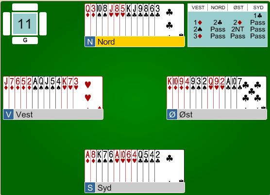 Olav forteller at etter han fornøyd hadde meldt en ruter så "forsvant" det en kløver og dukka opp en "spar" til.... Dermed ble 2 spar i neste melderunde tolket av makkeren som minst 4 ruter og 4 spar, hvorpå 2NT meldes. Det er jo ikke urimelig og viser vel omtrent en slik hand. På 3 ruter går det imidlertid pass rundt.... I ettertid lurer Olav på hvordan finne optimalkontrakten 4 spar. Det er flere mulige måter å gjøre det på, men den mest tradisjonelle vil vel være å melde inn 1 spar hvorpå makker har til 2 spar (6-9 og trekortsstøtte) over 2 kløver. Når det nå meldes 3 ruter etter at makker har støttet i spar, så vokser kortene og øst bør ta imot invitten og avslutte med 4 spar. Men - dette må man selvfølgelig ha avtaler på.