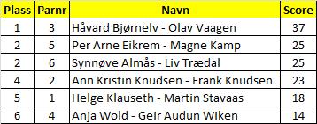 I spillingen så var det jevnt i toppen, og flere hadde muligheten til å vinne, Odd Arne og Arild vant foran Arne og Øyvind, rett bak som kom Bjørn og Knut, Jon Inge og Frode (Solberg) har begynt å stabilisere seg i toppen, og de fikk en 4 plass. Resultatlisten, Sanna og Liv fikk en velfortjent premie som beste B-par.