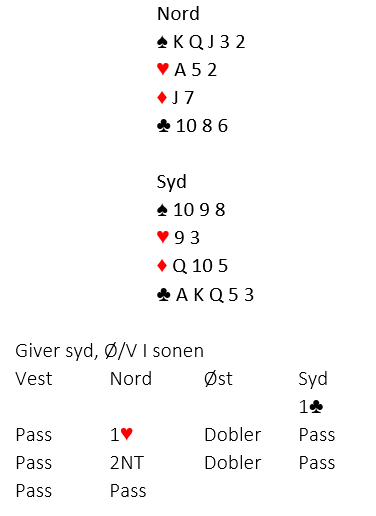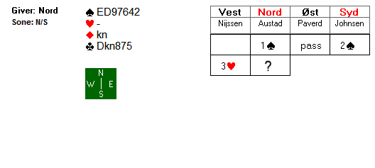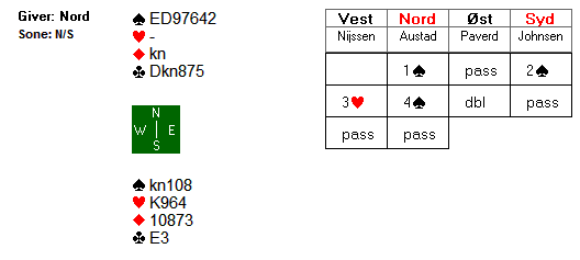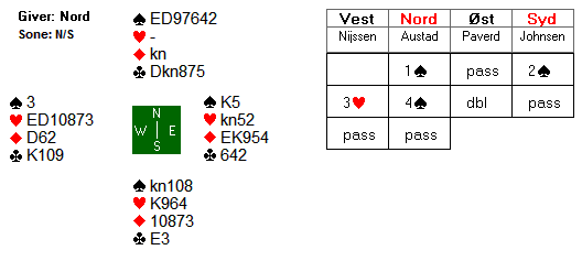 Marius åpnet med 1 spar og fikk noe overraskende høre 2 spar fra makker Christian Fredrik Johnsen. Deretter meldte vest inn 3 hjerter. Nå tok Marius en liten tenkepause før han plukket 4 spar fram fra meldeboksen. Øst doblet, og det gikk pass rundt.