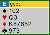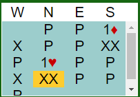 De forsøkte altså å flykte fra 1 ruter doblet, og det så litt skummelt ut for meg. De lignet fælt på slike spill hvor man har straffepasset makkers dobling av 1 i minor, så flykter de til 1 i major og du får den snikende følelsen av at nå vil makker straffedoble så fyker det hjem hvis du passer. Det ble enda skumlere da han ene redoblet idet makker som forventet doblet 1 hjerter. Men det var bare å la det stå til...