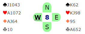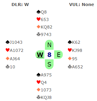 I 5hj x kom spar Q ut fra syd. I frykt for å miste overgangene hvis trumfen sitter 3-1 velger jeg derfor å satse alt på 2-2-sits. Jeg topper derfor hjerteren, med suksess. Nå var det bare å etablere kløveren, så var jeg hjemme med 11 stikk. Hvem skulle trodd at 17 hp tilsammen i makkerskapet skulle være nok til 11 stikk?!