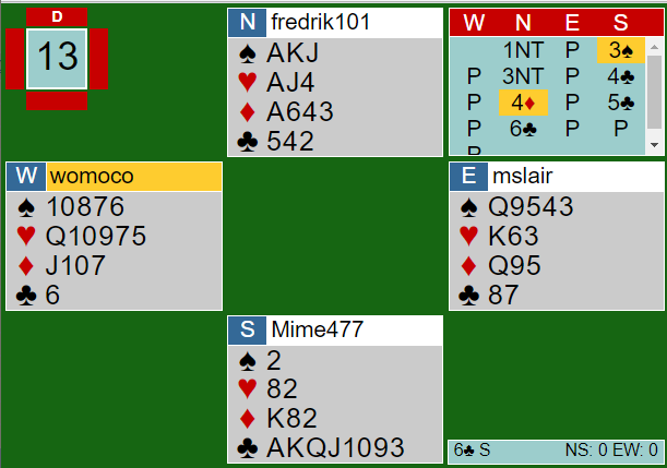 Syds 3 spar viste kortfarge. Nord hadde den fargen skikkelig stoppet og sa 3 NT. Når så Martin kom tilbake med 4 kløver var det sleminvitt. Fredrik kontrollmeldte 4 ruter, og da Martin ikke hadde mer å fortelle om (ikke hjerterkontroll) med 5 kløver hadde likevel Fredrik til å løfte til slem med helt maksimum og en hånd full av ess. Åtte poeng i makkerens singelfarge er normalt ikke så bra, men det er toppstikk og sparen gir ett, kanskje to avkast. Godt vurdert!