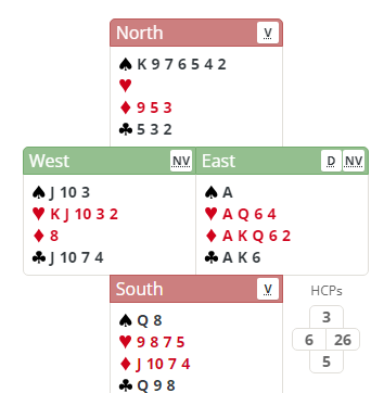 Med kun tre stikk i ruter er det kun syv stikk utenom hjerteren. Spillet handler om hva som må gjøres først. Da spillet forekom var det flere som stakk seg inn i spar og tok ruterfinessen. Da den røk og det kom spar tilbake ble de avhenige av at hjerter ess satt sammen med kun tre spar (en sparrunde kan lasjeres for å bryte forbindelsen i den fargen). Siden den med fem spar hadde hjerter ess ble det bet:
