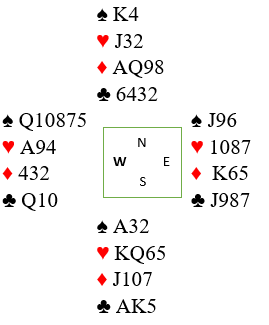 Syd er spillefører i 3NT uten at motparten har latt høre fra seg i meldingene. Vest spiller ut spar 5, norsk fordeling.