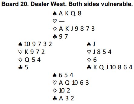 Da den finessen lyktes spilte han tre store spar fulgt av den fjerde sparen som ble stjålet med syds andre trumf. Øst kunne bare se på og kaste unna tapere, mens vest som hadde igjen trumfdamen dobbell måtte følge farge i alle sparrundene. Etter sparstjelingen fulgte kløver til stjeling hos nord og uttrumfing. Dermed ble det tretten stikk og + 2140 som ga alle poengene – samt en IBPA pris!
