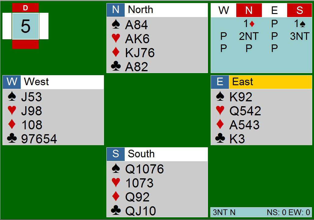 Hele spillet kort for kort kan du se her. 9 av 10 spillere var i 3NT, hvorav tre fikk den hjem. De to andre som fikk den hjem fikk ikke hjerter ut. Resten gikk en og to beit.