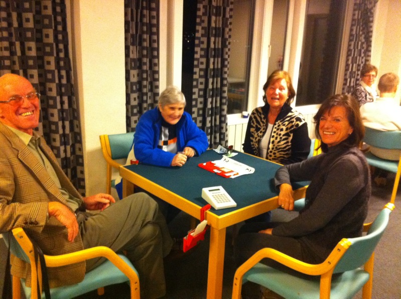 I runde to var vi kommet godt i gang med første spill. På bord to (bildet) viste det seg at Lise og Barbel som skulle spille mot Else og Kjell hadde satt seg ned slik; Barbel og Else som makkere og Kjell og Lise som makkere! Ikke nok med det, de var godt i gang med meldinger også.... Rart Lise ikke reagert på at Barbel hadde blitt så korthåra....
