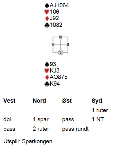 jeg burde ikke ha meldt 4 Ruter i Øst, men jeg syntes det så litt morsomt ut og tok sjansen....til makkers fortvilelse som ikke unaturlig meldte på 5 trinnet
