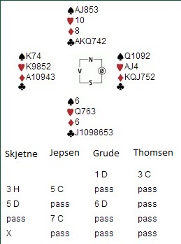 Here is another exciting board that went in favor to Norway. With 7-4 in two suits Signe Buus Thomsen decided to preempt with 3 clubs. When Grude raised 5 diamonds to six there was hard for Jepsen not to bid 7 clubs. Ellingsen in closed passed after the 1 D opening and that gave him the chance to lead his stiff spade and ruff the next one against 6 diamond. 8 goldworthy imps to Norway.