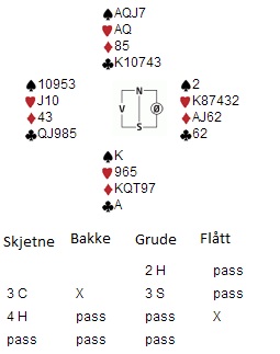 Olrudpåsken blir årlig arrangert helgen før påsken virkelig setter inn. Først ut er en åpningsturnering, denne er normalt basert på at man drikker og at man har det hyggelig rundt bordet. Ronny Korsmo med makker Ove Andersbakken kom til slutt på en 5 plass i denne turneringen, det var 23 par med. Det var inen andre Jessheim spillere med her. Vinnere ble Norgesmester i par Nils Kåre Kvangraven og landslagssspiller Odin Svendsen. Beste romeriking ble John Roar Stein fra BK Norrøna på 2 plass med makker Jan Erik Sandnes. Deretter var det parturneringene, disse startet lørdag morgen og varte ut til lunsj på søndag. Jessheim BK var representert i både Mester og A-pulje. I A-Pulja stilte Lars Kristian Moen og Per Erik Langbråten som makkerpar. Bjørn Bergersen spilte med Helge Berg fra Lørenskog BK. Det stilte hele 48 par på startstreken, Bjørn ble beste Jessheim spiller i år. Sammen med makker kom de til slutt på en fin 7 plass. De var lenge med å kjempet om seieren, men mot slutten ble det nok litt stang ut. Lars Kristian og Per Erik som var regjerende mestere i denne pulja, kom til slutt på en 18 plass. Jeg mener å huske at de aldri var med helt der oppe, men 18 av 48 er uansett godt jobbet. I Mester pulja var det flere Jessheim spillere, Thorval og Kurt Edgar, Svein Otto og Halvor, Jan Frode Karlsen med makker, Olav Lomsdalen med makker, Ronny med makker og Martin og Geir. Best av alle ble for øvrig Kåre Bogø og Bård Kåre Græsli fra Singsås BK. Disse gutta har vist en enormt god form i det siste, de er med å kjemper om seier i nesten alt de stiller opp i. Best av Jessheim parene ble Thorvald og Kurt, de kom til slutt på en god 6 plass. Svein Otto og Halvor var med helt oppe største delen av turneringen, en 10 plass var nok ikke det de hadde håpet på. På 9 plass fant vi Jan Frode med makker, de hadde en rufsete start hvis jeg husker rett, men klatrer godt på slutten. Olav og makker kom til slutt på en 20 plass, rett over middels. Disse vil for øvrig danne et fast makkerpar i divisjonsspillingen i året som kommer. Så Jorunn kan fort ende opp med å bli Jessheim medlem ganske snart. Ronny med makker hadde liten om ingen glid, det var mer minus enn pluss i nesten alle runder og 5 sist i det 34 par store feltet var ikke mye å skryte av. Martin og Geir slet tungt på samme måte som Ronny med makker og måtte til slutt ta til takke med 32 plass. I Lagturneringen som gikk av stabelen søndag etter lunsj og mandagen var det også Jessheimspillere med å kjempe. Olav og Jan Frode spilte på lag "Lomsdalen", mens Ronny, Svein Otto, Martin og Geir spilte på lag "Korsmo". Sjøsamen som ledet turneringen nesten fra start til mål, var nesten uslåelige, selv om lag "Korsmo" burde ha vunnet kampen mot dem som for øvrig ble BBO overført. Martin og Geir plasserte seg helt i toppen på butleren, et snitt på 0,33 IMP vunnet per spill er OK. Jan Frode Karlsen og makker Kjell Otto Kopstad vant butleren med et utrolig snitt på 1,39 IMP per kamp. Well done!! Lag "Lomsdalen" ble beste Jessheim lag, det kom til slutt på 4 plass, bare 1VP opp til 3 plass. Lag "Korsmo" måtte ta til takke med 9 plass, vel vitende at 3 spill i 2 av de 3 siste kampene kunne vippet dem opp til 2 plass totalt..... Austmarka er en turnering som blir arrangert hver skjærtorsdag ute i de dype skoger Nord/Øst for Kongsvinger. Årlig så kommer det mange romerikspar dit, men i år var det kun ett Jessheim par. Ronny og Henning som var faste makkere for noen år siden, stilte opp og vant like så godt hele skiten. Etter en rufsete start, å bare så vidt over middels ved lunsj, så spilte de stødig etter lunsj og var med i teten hele veien. Før siste runde så var de på 2 plass, men en forrykende siste runde, som mot de som ledet måtte svinge seieren til deres fordel, var det lite spenning før slippene kom ut. Andre Romerikspar som var der... Alf Gunnar Pedersen(Haga BK) og Morten Eriksen(Aurskog BK) på 2 plass, Johnny Horfseth og Dan Sandbekkbråten (begge Aurskog BK) på 6 plass. Lars Erik Ottershagen(Haga BK) og Andrè Hagen(Aurskog BK) på en 7 plass. Hans Olav Vestereng og Per Ottar Bjerkely på 8 plass, Gunnar Erik Hammer og Per Otto Hammer på 9 plass, begge siste parene fra Aurskog BK. Henry Hansen som tidligere spilte fast i vår klubb var også tilstede, han spilte med slekta til Kasserer Per Erik Langbråten, nemlig Roar Langbråten. Henry satt ikke i draget, men det var utrolig hyggelig å hilse på en gammel kjenning fra egen klubb. Det var for øvrig 19 par på startstreken, som skulle kjempe over 51 spill.