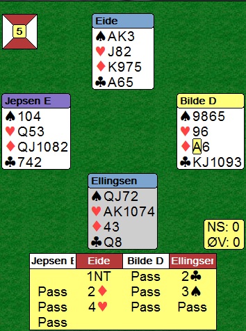 As you see the auction was quite similar, but it looks like there was a misunderstanding with 3 spade for the danes when Jepsen decided to bid 4 spades rather than 4 hearts. Skjetne led his queen of diamond, small, small small. He switched to a club, and when Grude cashed his Ace of diamond they made the perfect defence for down 2. 13 Imps to Norway when 4 hearts by North is unbeatable.
