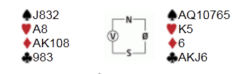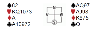 I spill 23 var det vest sin tur til å bryne seg i en slem. Du sitter vest, og skal spille 6 hjerter med liten ruter ut fra nord: