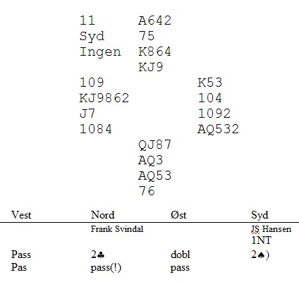 Frank Svindahl er et eventyr av en mann. Når jeg diskuterer bridge med han, virker det som han er prinsippielt uenig med de fleste. "Dere har ikke skjønt strukturen i hånda!!", er et fast uttrykk når jeg og kaninen melder annerledes en "Svinet", som han kalles. I et spill med Jon Solli Hansen i helga SM åpna Frank i 2NT med sine 21 balanserte og da makker kom med noe som ligna en sleminvitt i spar, cuebidda han ruter på to små. Vi spurte hvorfor han gjorde det og svaret var dette, "Jeg bare rulla i meldingsforløpet.." (Spør makker Solli Hansen hvis dere tror jeg lyver) Så kom dette spillet og historien starter i spillet før, spill nummer 10 av 12. De hadde sinnsykt dårlig tid, omtrent 11 minutter på tre spill. Frank satt i nord og det gikk tre passer fram til han. Mange ville åpnet på korta, men et kikk på klokka gjorde valget enkelt, "PASS"