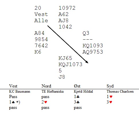 er et sørlandsk kraftuttrykk om noen skulle være i tvil. Jeg har skrevet tidligere om fair play i bridge. Sist var fra fjorårets SM der makker bak skjermen tok feil i meldeboksen og kom i skade for å legge opp gal lapp. Nestemann meldte pass, men så oppdaga makker fadesen. Lovene sier at da skal meldinga ligge, men de fleste av oss (håper jeg i alle fall) vil la motstanderen ta opp og bytte. I alle fall hvis det helt opplagt var et bomskudd. Husk at makker på den andre siden har ikke sett noe. Det fikk han ikke lov til og trauet ble sendt over. Skam, sier jeg bare. I runde fire kom dette spillet: (I det jeg skriver videre, tar jeg forbehold om at jeg har blitt referert korrekt) Vest sin 1sp ble alertert fra Baumann til Charlsen, men ikke fra Hildal til Hoftaniska. 1sp viser normalt en balansert hånd en ikke har lyst til å meldt NT med, men kan også inneholde diverse hender med ruter og/eller kløver. Tor Erik Hoftaniska kunne velge mellom 2kl, en god løft til 2hj, eller 2hj som han gjorde. Jeg tror ikke Kjetil Hildal ville fått mange poeng i meldeklubben for 3kl på sin minorhval, men han valgte å vise hånda som en enseter i kløver. 3hj fra Thomas Charlsen er ikke invitt, kun fight om kontrakten. Når trauet nå kom over til Hoffa/Hildal, kom Hildal på at han skulle alertert 1sp. Det gjorde han forsinket og innrømmet sin brøde. Pass rundt. .Slik burde historien etter min mening endt, men når det viste seg at sparkutten gikk og 4hj sto, tilkalte Hoftaniska TL. Han hevdet at hvis han hadde fått rett forklaring på 1sp, ville han meldt annerledes og de ville kommet i 4hj. Ikke i 4sp på 4 -4 fordi det er beit, men 4hj. Men andre ord mente Hoffa at hvis vest hadde en hånd der ruter to hadde bytta plass med spar to hadde de andre konvensjoner tilgjengelige, konvensjoner som ville ha endt i utgang. På en måte er det ikke noe galt i å tilkalle TL og fortelle hva som har skjedd, men det får være grenser!! Her har bergenserne et kjempespill i 3hj - 170 der 75% av salen spiller utgang i ruter den andre veiene. Nei, de skal klemme ut enda mer saft og hente 2 IMP til. Jeg håper 97,3% av dere er enige med meg når jeg sier at NS overhode ikke var skadelidende. Vest hadde bare en spartoer for lite og NS hadde alle muligheter til å melde utgangen sin på nitten honnørpoeng. Selv om en person har glemt å alertere, kan da de ikke være automatikk i at han skal dø i synden, bli steinet og hengt opp ned etter tåneglene? Nå burde historien for andre gang endt her, men tror du ikke Turneringsleder gir Hoftansiska - Charlsen medhold og justerer spillet til 4hj - 620! Det finnes vel ikke et levende menneske i øst som hadde latt NS spille en utgang i sonen med sin hånd, men han stakkar får ikke lov til å melde. Vest-Agder appelerte selvsagt og i Seriemesterskapet er reglene slik at det er lovutvalget i NBF som er behandlende instans. Nå må altså de bruke tid på å samle seg om det jeg kaller en meningsløs protest og en enda mer meningsløs turneringslederavgjørelse. I alle lovbøker må det være noe som heter sunn fornuft, uansett om det etter boka har foregått et lovbrudd. Jeg er helt sikker på at Per Nordland er uenig med meg og han ønskes velkommen til å komme med en kommentar. Jeg oppfordrer herved Hoftaniska og Charlsen til å trekke protesten, be om at spillet justeres tilbake til +170 og si at lovutvalget kan bruke tiden sin til mer fornuftig ting.