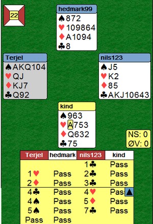 Litt lenger nede skreiv jeg om et spill der Roar Voll og Asbjørn Kindsbekken kom i 6hj med to ess vekk. Terje og Nils ville ikke være dårligere. 4sp er Blackwood og 5ru viser to ess av fem.