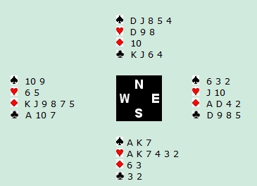Spillet forekom i Seriemesterskapet i 1997 og lagkameratene - de kjekke brødrene Mæsel fra Kristiansand -hadde fått hjem tolv stikk i fire spar. Mot Tom Høiland og Øystein Jensen hadde motparten slemambisjoner, men etter at Nord hadde cue bidet ruter (som Tom klokelig lot være å doble), skulle Øystein spille ut mot fem hjerter. Etter å ha tenkt over situasjonen, lå ruter konge på bordet. Den beholdt stikket og fortsettelsen ble liten kløver. Alt tydet jo på at Øystein hadde minst to topphonnører i ruter, dermed var det å håpe at Øst hadde esset i kløver. Liten kløver ble forlangt fra bordet og dermed kunne Tom ta for damen og fortsette med kløver til Øystein`s ess. En bet gav selvfølgelig godt med imps.