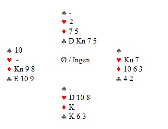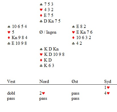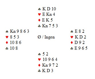 De to første rundene i NM lag er snart ferdig og turneringa starter på ordentlig med trekninga av tredje runde. Da kommer også de syv lagene som hadde WalkOver inn. Her kommer et fint motspill fra Larvik. (skal selvsagt stå pass i vest) Jan Tore Berg sitter i vest og spiller ut spar til makker, Per Erik Austberg, sitt ess. Mer spar. Spillefører legger ned hjerterkonge til esset og enda en spar. Nå må spillefører komme seg inn i bordet, så han spiller ruterdame til esset og hjerter til kapp. Så en liten kløver mot bordet i denne stillingen: På den lille kløveren freser Jan Tore opp på esset og spiller den trettende sparen til trippenrenons. Makker kaster kløveren sin og spillefører er sjanseløs! Bra!! En bedre spilleføring hadde vært å spille kløver FØR ruteren. Da skal det mer til for vest å gå opp på esset og spille spar. Husk at det enda ikke er avslørt at ruteren er uten taper.