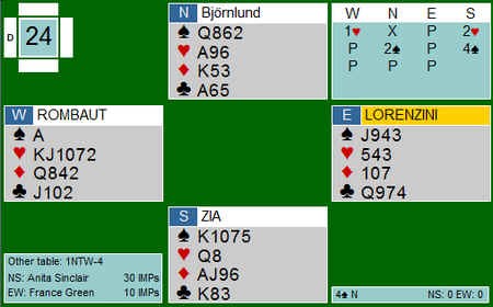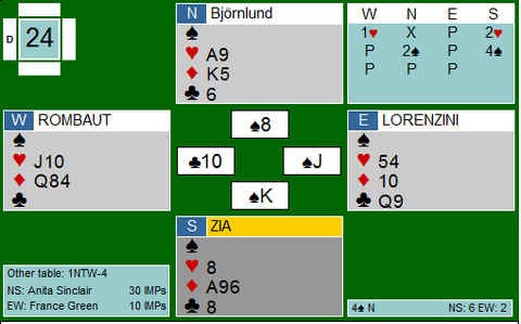 Selv med åpne kort må du bruke tid for å finne vinnervarianten? Ruter til kongen, hjerter ess og mer hjerter. På hånda forsvinner kløvertaperen og E9 i ruter tar de to siste!! FANTASTISK er eneste ordet som dekker slike prestasjoner.