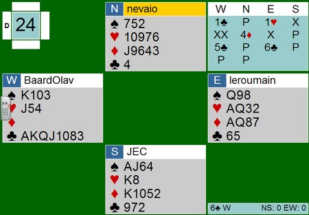 I går delte jeg ut pris til Finn Brandsnes. I dag er det Baard Olav Aasan som nesten overgår. Det er ikke hvem som helst som sitter NS. Syd er James Cayne og nord er en italiensk toppspiller. (husker ikke helt hvem). BOA får spar ut til esset og mer spar. Syd er markert med de uteværende honnørene og da ser dette tungt ut? Syd kaster etter bordet og ser ut til å ha kontroll. I slike posisjoner er trumfskvis det eneste som virker . Hvis du tror systemteori er det eneste BOA kan, så titter du bare under. Han tar seks ganger trumf, kaster tre hjerter og en ruter i bordet. Stillingen er: Så spar til damen og syd er ferdig. Kaster han en ruter, spiller BOA ruter ess og ruter til stjeling. Bordet står med hjerter ess som inntak. Kaster Syd hjerteren, tar BOA for hjerter ess og feller kongen, ruter ess og kaster den lille hjerteren (nord burde holdt en hjerter mer og en ruter mindre). Ruter til stjeling og hjerterknekt står. Magisk igjen!! HER ER SPILLET LIVE