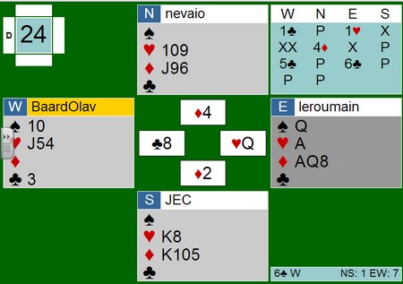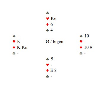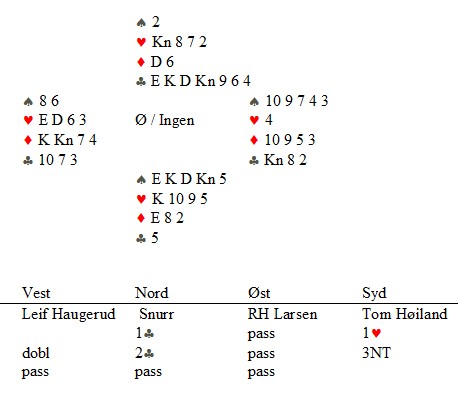 og det var min makker, Tom Høiland, som var helten. 1hj viser spar og 2kl benekter sparstøtte. Leif Haugerud spilte ikke unaturlig ut ruter til damen som stod. Så fire ganger spar og tre høye kløver. Nå var det mange kort igjen, men Tom claima og sa "Resten står på en tosidig skvis.." Motparten vet at Tom har rett når sier sånn, men for skams skyld måtte han spille noen kort til. Her er posisjonen med tre kort igjen. På den siste kløveren må øst holde spar 10. Tom kaster sparen som har gjort nytten. Vest må holde hjerter ess. Ruter åtte tar det siste og alle tretten til Vågsbygd.