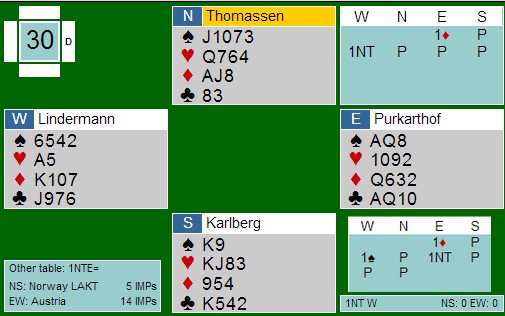 Dette spillet er fra forrige helgs landskamp mot Ungarn og Østerrike. BBO er avslørende og viser at noen kortspillere er flinkere enn andre. Østerrikerne viser dårlige vurderinger i både meldingsforløp og i spilleføringer, mens Norge gjør fine prestasjoner ved begge bord. Noen av dere sier sikkert at "det skulle da bare mangle.:", men jeg tror ikke nivået under de aller beste i EM er så skremmende. En dobbelscore er tross alt mellom 5 og 7 IMP det også, omtrent like mye som en vunnet utgang mot delkontrakt. (400 vs. 150 f.eks) Meldingsforløpet oppe til høyre er østerrikerne sitt, mens Allan og Terje melder nede til høyre. Vest hopper over en anemisk sparfarge, men det er det da ingen grunn til? 4-4 i spar spiller nesten alltid bedre enn NT. Terje og Allan får også NT'en på rett hånd, den som har oppspillsverdier. Kurt Ove spiller ut spar knekt. Lindemann bruker damen, en opplagt feil. Bruk esset og gå på en av minorfargene må være bedre. Om en skal starte i kløver eller ruter er jeg ikke sikker på. Spardamen ble stukket av kongen og det kom mer spar. Nå var spillefører allerede ferdig. Lasjerer han spar ni, få han hjerterskiften på seg. Ikke noe bedre. Lindermann stakk sparaen og spilte ruter til tier og knekt. Det hele endte med bare fire stikk og tre sonebeiter. Allan fikk verste utspill med hjerter. Rett opp på esset og kløver til kapp. Syd tok for to høye hjerter og spilte makker inn på den siste. Derfra kom det en liten (?) spar og Allan la enkelt åtteren fra hånda. Syd stakk selvsagt med nieren og spilte kongen opp. (Husk at øst er den skjulte hånda). To i spar, hjerter ess, ett i ruter og tre i kløver ga akkurat de syv Norge hadde bedt om og pluss 90 inn. Sånne spill vinner en også lagkamper med.