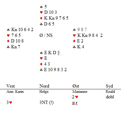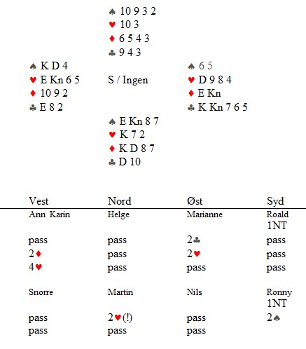 Helge Mæsel var aggressiv, Når jentene fikk han til å gjette, var det ikke annet å gjøre enn å gjette rett. 3NT er ofte et godt valg. En av de sterkeste svake to jeg har sett, men det står vel 8-11hp på systemkortet? Etter hjerter ut, var det "bare" å spille kløver ess og mer kløver for å håpe at vest ikke kommer inn. Når hun heller ikke hadde ruteresset, ble det hjemgang å bokføre. Martin og Ronny stoppa i 4kl på det andre bordet og en avgjørende gevinst til Kristiansand. Dette var det fineste spillet i hele kampen synes jeg. Og ved begge bord var Farsund sjef. Martin Reinertsen oveførte til 2hj helt a tempo og fortrakk ikke en mine. To beit. Helge Mæsel passa mer naturlig. 2kl fra Ann Karin viser kløver og en major, mens 2ru søkte tter majorfargen. 4hj var hardt og aktuelt. Mot 4hj kom det ruter konge ut til esset. Hjerter til knekten og ruter til knekt og dame. Roald tok for sparesset og fridde seg i ruter. Marianne fant ikke hjerteren, men det gjorde ikke noe. Hjerter ess, KD i spar og hjerter til Roald sin konge. Han måtte enten løse kløveren eller spille ruter/spar til dobbeltrenons slik at kløvertaperen forsvant. God bridge!!
