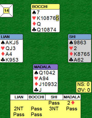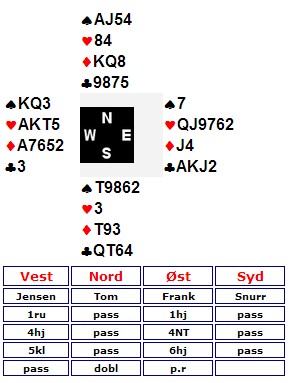 Det første er en svært aktuell dobling av Tom Høiland. Det er ikke sikkert det er beit med ruter ut, men oppsida er stor. I syd gjorde jeg som jeg hadde fått beskjed om og vi rakk å sette opp ruterstikket før det forsvant på spar. Konvensjoner har et oppside og en nedside 2ru i åpning viser ruterfarge og akkurat fire spar ved siden av. Da unngikk kineserne 4sp og 3NT "spilte seg selv." Tre ganger hjerter ut. Så spar ess, kløver til kongen og spar ni som seilte (!). Ni stikk.