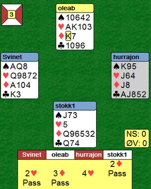 Du sier spillet under at jeg skulle lasja ruterkongen. Det har du for så vidt rett i , men når jeg fikk beholde for hjertersyveren var det enda svært lett å vinne 4hj. Nord var tegnet med EK10x og da var det bare å spille ruter for å bryte forbindelsen til stjelinga. Et stålegg, rett og slett.." Javel, sier jeg da. Stålegg bruker jeg om rimelig mye større feil enn det, for å si det mildt.