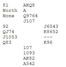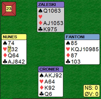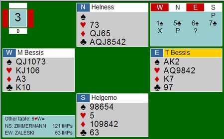 Jeg begynner nesten å bli lei av å skrive om turneringer som Helgemo - Helness vinner. Nå er det åpent mesterskap for lag i Frankrike og det ser ut som Zimmermann cruiser her også: HJEMMESIDE Jeg liker å prøve teste meg selv på meldeproblemer som dukker opp på BBO eller andre steder. "Hva ville jeg gjort ved bordet i den situasjonen?". Det er lærerrikt å se hvilke aksjoner de beste gjør likedan som meg og (minst) like lærerikt å se hvor vi skiller lag. I spillet under vant Geir Helgemo 12 IMP i sin kamp. Jeg må innrømme at jeg ikke ville vært i nærheten av de IMP'ene om jeg hadde sittet på Geir sin plass. Hva med deg? Motparten har kommet i 6sp. Der har du fem kort i mot og ellers INGEN stikk, verken i medspill eller motspill. Likevel melder Geir 7kl, til tross for at han ikke har den ringeste peiling på hvilke kort makker har !! Tor går sine 800, men det var en glimrende stamp mot 1430 på det andre bordet. Der kom de riktignok i hjerterkontrakt på vest sin hånd, men 6sp er også ubetelig, Jeg tror det er slike spill som er forskjellen meg meg/deg og de aller beste.