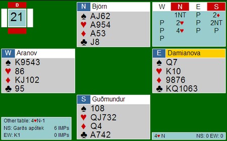 Det er ikke noe godt tegn fordi det betyr at det har ikke vært noen norske på lederbordet. Der har det vært stort sett islendinger og de spiller flott. Her er et eksempel der Damiinova fra Bulgaria gjorde feil som ble skjebnesvanger.