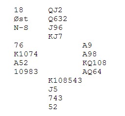 Det sier jeg til fyrverkeriet Jon Solli Hansen både titt og ofte. Han er en superflink spiller, men på mange måter sin egen verste fiende. I det ene øyeblikket kan Jon som spillefører være mer pessimistisk enn en fredsmekler i Midt-Østen, mens i neste øyebllikk kan han plukke ut ideelle damer og knekter i en 12-14NT hos makker. "Det står 6kl hvis du har ruterdama dobbel og knekten fjerde i kløver, makker!!!" Et og annet skuddår går hans våte drømmer i oppfyllelse og da presser tårene på når han forteller om ruterslemmen som sto på 4-2 tilpass. Forrige onsdag kom dette spillet: