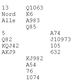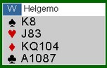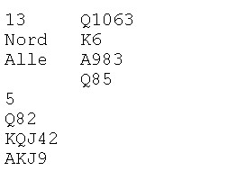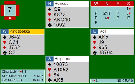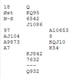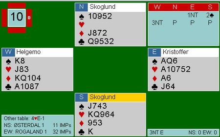 Søke etter 5-3 i major? Dette er et evig tilbakevennende tema. Makker åpner med 1NT og du kikker ned på hånda til venstre. Jeg vet ikke om noen har system til å finne ut først om makker har fem hjerter, så om han har bare tasser i spar ved siden av. Noen kikka ned på en sparhonnør og godt med honnørpoeng og meldte derfor 3NT rett inn. Andre søkte og fant (dessverre) makker med fem hjerter. Ser du under og litt til venstre skjønner du fort at 4hj ikke var rett kontrakt.