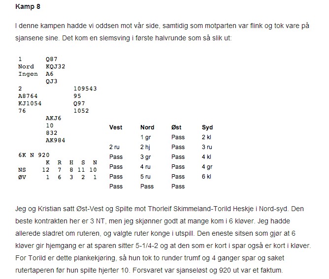 I helga sa "alle" at 6kl er beit med ruter ut. Tohild Heskje motbeviser at det stemte og det var med kun halvparten av kortene synlig. Kanskje det aller beste spillet jeg har hørt om og takk til Kristoffer Hegge for at jeg får stjele fra hans side HEGGEBRIDGE.COM Torhild Heskje, her sammen med Kristian Stangeland.