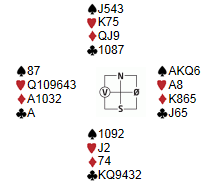 Svein Ove kunne med åpne kort gjort det enklere for seg selv i dette spillet, men det er jo artigere når det presser seg fram med en skvis. Som sør åpna jeg med 2 spar, som kan være både 5 og 6korts, svak, og etter litt frem og tilbake fant Svein Ove i øst ut at han skulle spille 3NT: