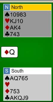 Har holdt på å bladd i gamle årsskrifter fra BK Grand, og fant et artig spill fra en bykamp mellom BK Grand (Ålesund) og Molde (på 1950-tallet). Moldenseren i vest spilte ut ruter dame mot 6 spar. Du stikker selvfølgelig i bordet og spiller? Vår klubbkollega fra Grand kunne sin teori og spilte spar til essen, og vest kom på med kongen. Så kan du sette deg syd og fortelle meg hva du gjør videre….. J