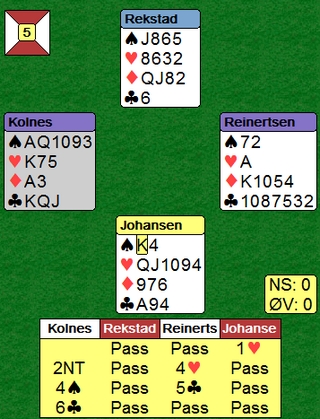 God Påske og gratulerer så mye til Anne og Vibeke. Lars Håvard og Ole får allerede torsdag en ny sjanse til å sikre seg et klubbmesterskap. Foran den 6, og siste omgangen leder de nemlig Klubbmesterskapet i Holmestrand med 10 prosentpoeng foran neste par som er Erling Galleberg – Arnstein Barstad.