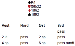 Spillet under har flere gode poenger, men først av alt kan du jo finne et godt utspill. Du sitter syd og skal spille ut mot 6 spar:
