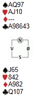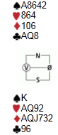 Etter å ha åpnet 1 ruter i 4. hånd meldte vest inn 1 hjerter. Nord meldte 1 spar og sør hoppet til 3 ruter. Nord spurte sør om hold med 3 hjerter, og syd plasserte kontrakta i 3NT. Ut kommer liten kløver.