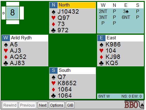 Ved å gå til http://www.bridge.no/Organisasjon/Nyheter/Bedriftsmesterskapet-2014 kan du se full rapport fra NM bedrift 2014. Der kan du også spille gjennom Arilds 6NT kort for kort.