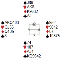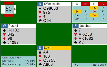 Robert Levin fant beste utspill med hjerter 10. Øst stakk med esset og spilte spar. Levin brukte esset og fortsatte med trumf til kongen. EK i ruter, men Weinstein trumfet ikke for å unngå å gi bordet et inntak. Neste ruter stjal han over bordet og spilte kløver. Øst bommet denne, men det var bare for den tredje beita og syv eller åtte stikk. På det andre bordet kom det ruterdamen ut og i stikk to spar til kongen som stod. Ut med trumfen og ruter til nieren i bordet som også vant. Nå var det det ellevte (!) stikket som hang på å finne kløveren.