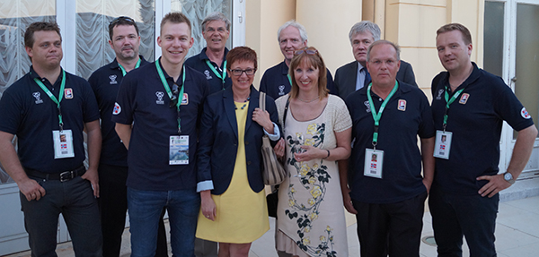 Lørdag kveld var det klart for åpningsseremoni i ballsalen på Kvarner Hotel, det første hotellet som ble bygget i Kroatia. Gammel eleganse, lysekroner og fresker dannet rammen for åpningen av det 52. EM for nasjonslag. I Kroatia og store deler av Europa forøvrig er bridge anerkjent av den nasjonelle olympiske komitè, slik at de selvfølgelig er til stede ved åpningen av et slikt mesterskap. Men enda mer gledelig var det at presidenten i Kroatia, Ivo Josipovic, beæret bridgen med sin tilstedeværelse. Flere taler, heldigvis korte, og litt sang var innholdet i selve åpningsseremonien. Alle land blir også lest opp og må reise seg for å vise seg for de andre lagene. Det er en hyggelig tradisjon å kunne se motstanderne man skal møte i disse 10 dagene. Etter selve åpningsseremonien ble det servert sprudlende vann på terassen, og damelaget mente jeg måtte omdøpe bloggen min til rosèbloggen. Jeg tok ikke mer enn to glass damer, bare to! Veldig hyggelig var det også at den norske ambassaden i Kroatia var representert på åpningsseremonien og vi hadde en hyggelig samtale med de. En hyggelig dame, som jeg dessverre ikke fikk med meg navnet på, spilte til og med bridge, og hun skulle følge nøye med. Hun lovet også at dersom Norge vant skulle de komme tilbake til medaljeseremonien. 5/6 av det åpne laget med representantene fra ambassaden. Norges ambassadør i Kroatia, Henrik Ofstad, bakerst til høyre. Damelaget er også klare til kamp: For seniorlaget var ikke alle kommet ennå, så bilder av de kommer senere. Nå lader alle lag til kamp og jeg er sikker på at vi får flere fine seiere i morgen. Kryss fingrene! *Oppdatert med noen flere bilder: