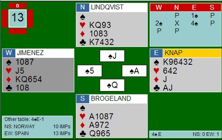 I spillet under fikk alle tolv eller tretten stikk. Espen Lindqvist fikk bare elleve og da må vel han være veldig dårlig? Det er Petter Haram som har sendt meg en mail som forteller at Norge fikk ruter fem (!!) i utspill. Den gikk til liten, tier og ess. Espen prøvde både kløver mot kongen og tre ganger hjerter til stjeling, men da ingenting av det gikk bra skjønner du helt sikkert hva som skjedde siden Espen har ruter 9 på hånda.