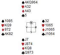 Hei Snorre Ser du etterlyser bidrag – så her kommer et par spill fra B-finalen for par i Fredrikstad om du vil bruke dem. Spill 15 så slik ut (S/NS): JT97 KJ3 K4 T985 A63 KQ84 T87 Q9542 QJ 986 AK764 Q 52 A6 AT7532 J32 Meldingene var raskt unnagjort - 1KL i vest, 1HJ i øst og 1NT i vest avsluttet meldingsforløpet uten innblanding fra NS. Utspillet var spar J, og jeg konstaterte raskt at vi burde vært i en annen kontrakt (2HJ). Utsiktene til å få tak i mer enn 6 stikk så ikke særlig gode ut, men kanskje kunne motparten hjelpe til? Et godt gammelt triks er å angripe motpartens farge, så jeg bestemte meg for å prøve dette. Utspillet ble stukket i bordet, og en optimistisk ruter til J i stikk 2 ble fortsettelsen. En for meg heldig lay-out, gjorde at det ble vanskelig for motparten å fortsette i fargen. For nord så det nå ut som mitt svake punkt var i hjerter, og han fortsatte med liten hjerter. Denne ble stukket med esset i syd, som heller ikke syntes ruterfortsettelse så attraktiv ut. Syd fortsatte med ny hjerter til tier og konge. Nord fant nå ut at kløver måtte være spilleførers svake punkt, og fortsatte med kløver 10. Jeg kunne nå ta hjerterstikkene og kvitte meg med en ruter dame og en kløver. Nord derimot fikk det nå tungt, og ble skvist i de svarte fargene. Han valgte å slippe en kløver, og kløver 7 ga 10 stikk i en i utgangspunktet håpløs kontrakt, og god score på spillet. Så et motspill (Spill 60 – V/NS): T973 98 Q9875 T3 AKJ86 52 K QJ76432 T32 6 Q874 A65 Q4 AT5 AKJ4 KJ92 Jeg satt syd, og hørte meldingene starte med 1SP – pass – 1NT. Jeg syntes ikke soneforholdene tilsa at jeg skulle delta i meldingsforløpet, og min pass ble etterfulgt av to til. 1NT ble forklart som naturlig 6-10, så jeg valgte ruter A ut for å kunne vurdere neste stikk. Etter at blindemanns kort ble lagt i bordet, var det åpenbart at spillefører måtte ha kløver ess og noe godt i hjerter. Med mindre spillefører hadde T9 dobbel i spar, så makker ut til å stoppe den fargen. Makker la styrke på utspillet, sånn at ruter dame så ut til å kunne være hans eneste honnør. Med kløverskift fra makker, så det ut til at vi kunne hente 4 (5?) ruterstikk, 1 stikk i hver av majorfargene samt kløver konge. Men – hva om makker hadde kløver 10? Kanskje kunne spillefører ledes til å tro på en annen sits enn den jeg så? Freidig valgte jeg å teste muligheten, og spilte kløver J. Spillefører lasjerte denne, og jeg kunne fornøyd fortsette med liten kløver til makkers tier og spilleførers ess. Nå fulgte spar til J og tre nye runder spar. Makker spilte så ny ruter, og sitsen i den fargen var avslørt. En noe slukøret spillefører måtte konstatere at jeg kunne cashe kl K (!) og hj A før ny ruter ble spilt slik at makker kunne ta de siste stikkene. 3 bet ga ren topp på spillet. Med vennlig bridgehilsen Per Helge Hansen