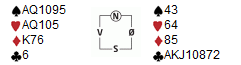 Boye og Espen er snart klart til å starte den store lagturneringa, Spingold. Jeg er ikke helt sikker når kvalifiseringa starter, men på onsdag skal det være 32 lag igjen. Da sendes det på BBO og vi håper lag Schwatz vises der. I tillegg vil det forundre meg om ikke Tor og Geir stiller for Zimmermann. I menyen til høyre er det link til resultater. I Sopot i Polen pågår det en festival med mange norske deltakere. Hittil er det spilt tre parturneringer over 30 spill, men i morgen (Mandag) begynner lagspillinga. Da kommer vi helt sikkert med flere norske i teten, håper vi.