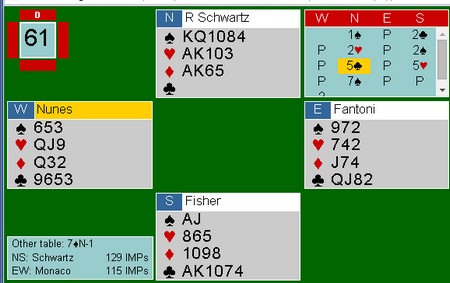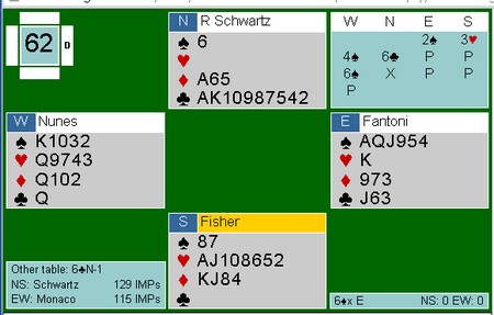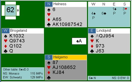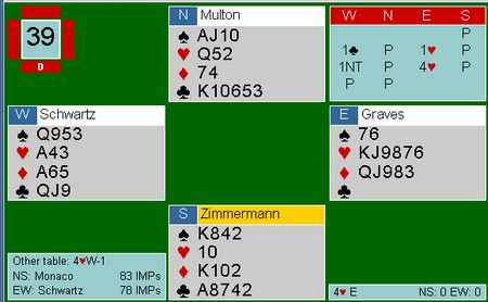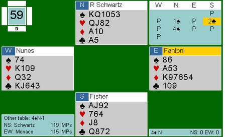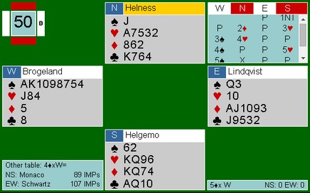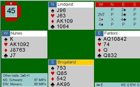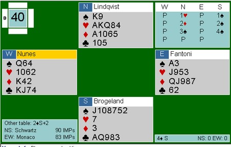 Tredje sesjon Den første store svingen var denne interessante 4sp-kontrakten. Espen og Boye stoppa i 3sp i det andre rommet. Schwartz spilte ut hjerter konge som Zimmermann lot vinne stikket. Jeg skjønner ikke helt logikken i fortsettelsen, men vest tok i alle fall for spar esset og skifta til kløver konge ! Nå ble det ti enkle stikk. Analyser er ikke min sterke side, men det ser for meg rimelig opplagt ut å fortsette i hjerter. Aktuelt stjeler makker og skifter til kløver. Nå er det ikke mulig å vinne kontrakten lenger fordi øst får enda en hjerterstjeling med spardamen når makker kommer inn på sparess. Kløverkongen kan heller ikke forsvinne. Schwartz var opplagt redd for at ruteren skulle gi avkast, men han kommer da inn på sparesset og kan skifte kløver hvis det skulle haste? Har spillefører KD10xx i spar, ser det tunt ut å beite. I spill 38 ble vel Boye vel ivrig når han meldte seg på over 1NT i øst? I alle fall hvis han ikke kan melde kløver naturlig. Det kosta 500 i 3kl, uten at motparten kunne vinne utgang. Så vinner Schwartz tilbake en utgangsving når han kapper hjerteren mens Nunes topper. 12 IMP. I lagkamper handler det mye om å vinne de harde utgangene. Over var et eksempel og her kommer et til. Nunes starter med kløver og da har Boye ti stikk. (4 + 3 + 1 + 2 = 10). Med noe annet enn kløver ut, sliter Boye med å få mer enn 4 + 3 + 1 + 1 = 9 før ØV henter sine fire stikk. Jeg liker Espen's 3 sp veldig godt. Ingen kan henge han for å passe 2sp som Moulton gjorde i det andre rommet, men Espen har flotte kort i sparkontrakt hvis makker har litt mer enn minimum. Denne gangen gikk ikke kløverkappen og spardamen satt heller ikke dobbel i kapp. Likevel føyk 4sp hjem. Jeg skjønner ikke hvorfor Fantoni - Nunes spiller to-åpningenene som de gjør. Det henger nok sammen med at åpninger på 1-trinnet kan være veldig sterke, men når 2sp kan være alt fra en vanlilg svake to til en åpningshånd, blir det mye beit. 2sp viser så vidt jeg vet 10-13 og minst femkort. Da må nesten vest invitere på en eller annen måte og paren kommer i dårlige utganger. I dette spillet satt EK i kløver rett, hjerteren 3-3 og sparen 3-3. Likevel er det ikke mulig å vinne mer enn ni stikk. Da er det noe galt. Graves - Schwatrz åpner med en god svake to spar og det går pass rundt. 6 IMP i gevinst.